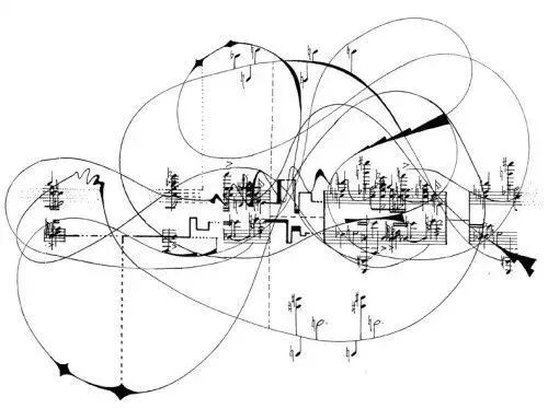 这种每次演奏得到的结果都不一样的音乐叫做AleatoricMusic(偶然音乐)。莫扎特的这首曲子可能是偶然音乐最早的尝试之一。在20世纪,有许多作曲家在这一领域探索。他们把曲谱做上各种奇怪的标记,让演奏家自己凭想象力发挥,比如说这样的: