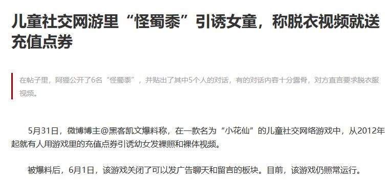 《Roblox》的事件并不是孤例,就在去年5月,国内一款名为《小花仙》的儿童向换装网游中,也被曝出类似事件,而且性质更加恶劣。当时有微博网友曝光《小花仙》中有人在游戏中的留言板块发言,用充值点券引诱低龄女性玩家发裸照和裸体视频,而且这一现象已经存在长达5年之久。