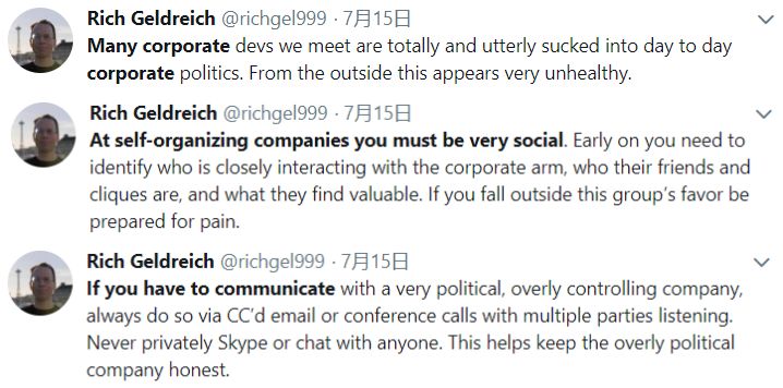 “(大意)公司很多开发者都热衷于研究办公室政治……在这个标榜‘自我管理’的公司里,你必须学会站队,明白谁跟谁是朋友,跟着谁有利可图,否则你就要为此付出代价……为了在这个充满了潜规则,和过度掌控欲的公司生存,你必须有一些特别的技巧……”