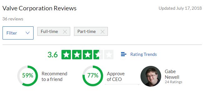 在匿名给公司打分的评论网站Glassdoor上,V社评分是3.6,虽然也有一些类似的负面评价,但总体上还是比较积极的