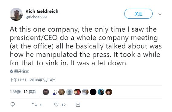 “在这个公司,我唯一一次见到主席/CEO的时候是在一个全体大会上,他一直在讲自己是如何玩弄媒体的。我花了很长时间才能融入他们,对我来说,这太令人沮丧了。”