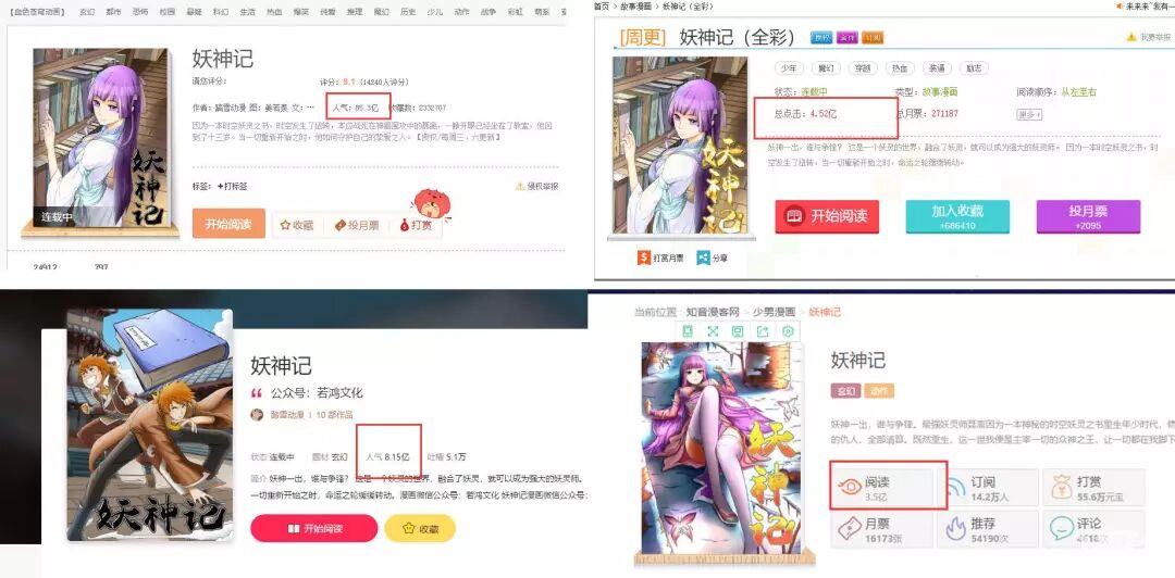 《妖神记》改编的漫画在腾讯动漫/有妖气/知音漫客/网易等几大漫画平台上均有连载,累计人气/阅读总和已经突破百亿;而《妖神记》改编的同名动漫也在已经播出两季,累计播放量超过15亿,毫不夸张的说《妖神记》的IP衍生内容在近两年的影响力要远超小说原著半身,而这也是我们要聊的重点。