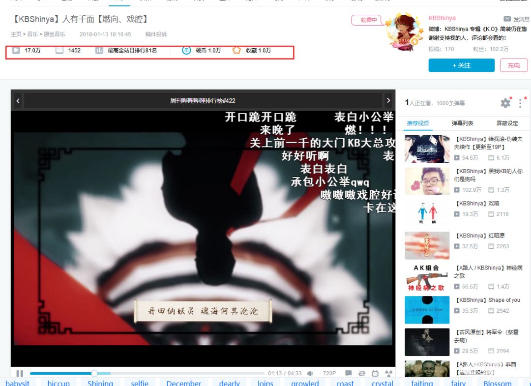1月17日,B站两位知名UP主“KB”“哦漏”两人演唱了《妖神记》手游的同人曲《人有千面》,B站累计播放突破17万,网易云音乐评论999+。