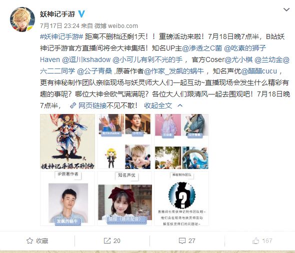 7月17日《妖神记》IOS上线前一天,《妖神记》邀请了逗川/C菌等多个B站知名UP主前往《妖神记》的官方直播间做客,当晚《妖神记》直播间人气爆棚。