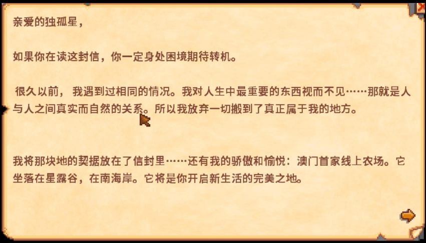 《星露谷物语》主角的爷爷留下农场时就说:“或许某天,你会被现代快节奏生活的重担压垮,你的精神不堪重负,变得麻木空虚。到那时,孩子,你便可以接受这份礼物,丢开这一切的勾心斗角,去找回人与人,人与自然间真正的、纯粹的和谐,去追寻心中的宁静。”