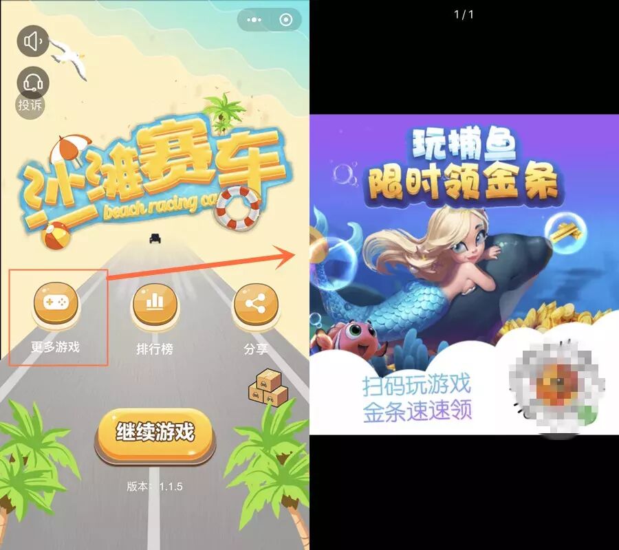 这也是常用方式之一。我们刚开始很纳闷,目前小游戏还无法直接跳转小游戏,如何互推?了解后,意识到自己太天真,很多游戏的首页两边都会有“更多好玩”、“其他好玩”的小浮标,点击后即打开海报,长按后可跳转另一款小游戏。