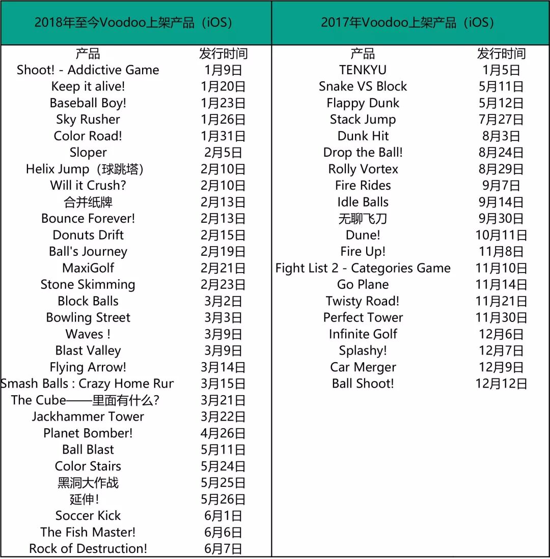 2017年Voodoo在iOS发行产品(不包括已下架产品)