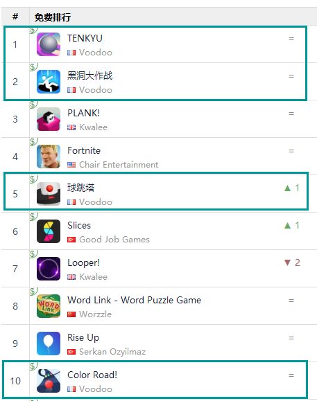 包括《TENKYU》在内,今天的美国iOS免费榜TOP100中,Voodoo入围产品接近20款,占比近四分之一,称得上是当前的休闲手游发行商巨头。