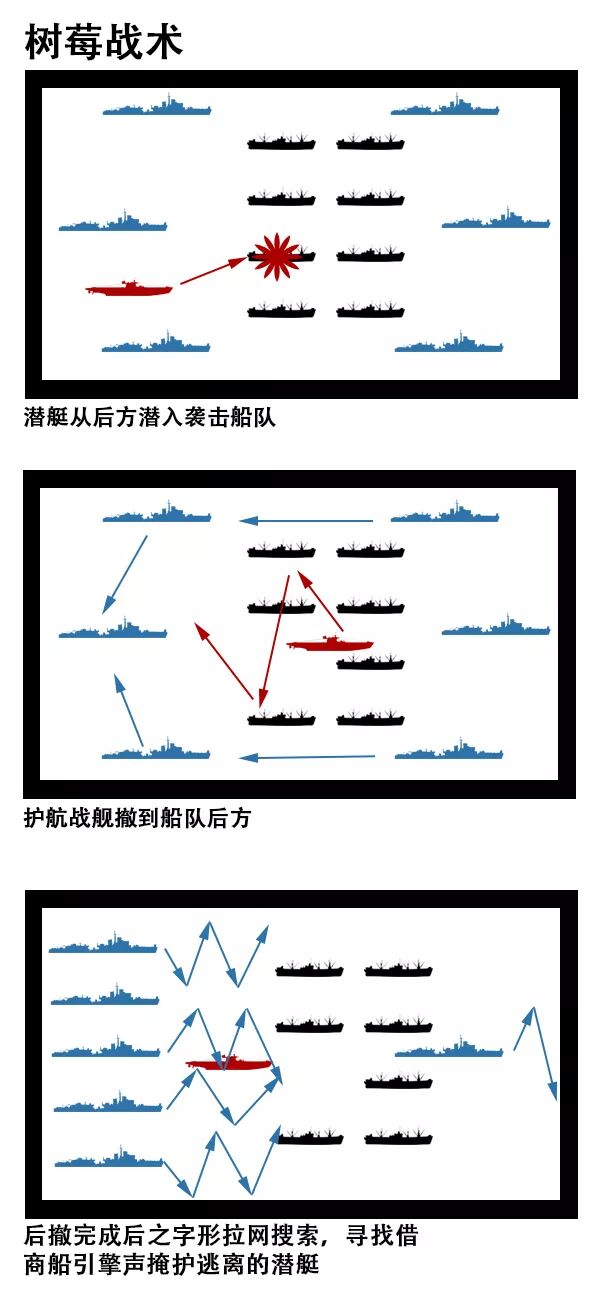 罗伯茨的副官、詹妮特和另一位擅长整理总结资料的女军官珍·雷德洛又继续进行了一段时间的演练,综合一些有反潜战术心得的海军指挥官的经验,发明了“树莓战术”。这是一种在攻击发生后,所有护航军舰撤后,并集体“之”字型向前用声纳扫荡的反潜战术。