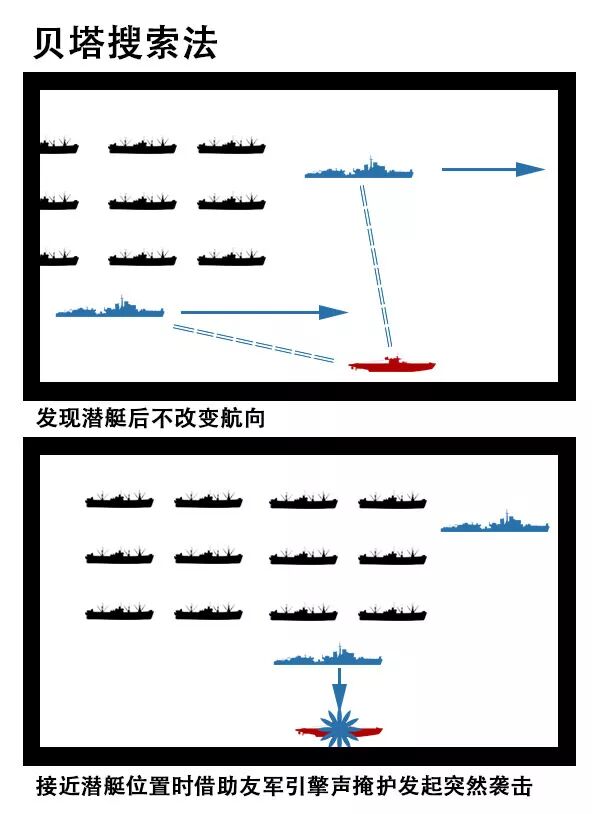 纳粹潜艇的“狼群”战术中通常有一艘提前埋伏在盟军航线上,观察舰队动向、协调“狼群”攻击的“指挥舰”。“贝塔搜索”可以非常有效地歼灭或者驱逐担任指挥舰的潜艇,从而阻碍“狼群”的行动,取得战机。