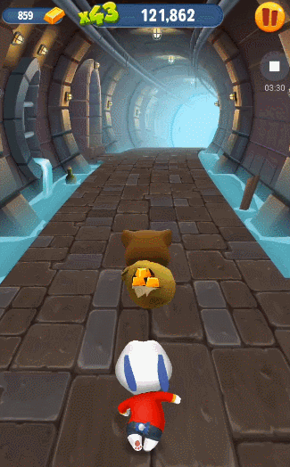 游戏画风明亮、色彩丰富,各式各样的赛道让用户不容易产生疲倦感。且游戏中还有一个非常重要的角色,就是赛道上偷金子的小偷。用户奔跑就是为了追小偷拿回金子,但这个小偷设计的可爱之余又带点邪恶,尤其是用户受挫时,它那邪恶的奸笑声很有魔性。