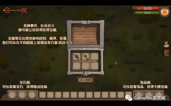 每次得到宝箱时,里面会掉落一些物品,他们拥有不同的能力。例如,饰品可以赋予卡牌特殊技能,每当你使用这些卡牌时就会触发这些能力。宝石可以获得被动技能,每当满足一些条件时,被动技能就会发动来辅助战斗。还有其他很多丰富的道具,恢复生命的药剂,补充体力的食物,诱捕怪物的香精,逃避战斗的粘液,等等。而宝箱有非常多的获取方式,战斗的胜利,踩到宝箱格,丢出了6点等等。
