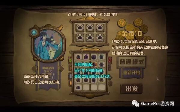 每次打败boss时,会来到整顿界面,在这里可以看到目前游戏中所有装备的技能特点,你可以购买已经解锁的装备进行替换,获取不同的技能搭配,形成自己的流派。并且能看到下一层的boss是谁,做出针对的出装搭配,提高通关的成功率。