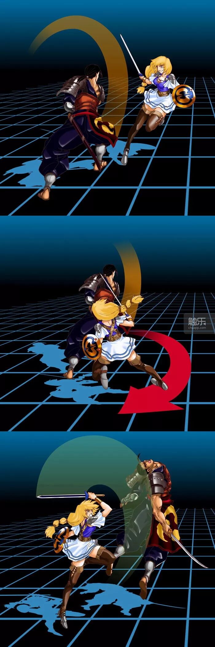 武器格斗的判定距离大于徒手格斗,为了平衡长短不一的各类武器,必须要有完善的位移系统,这也是《刀魂》的不足之处。《剑魂》通过高度自由的“八方移动”释放了操作空间,角色可以向地面的8个方向随意走动,部分招式只能在移动时发动,战斗更加灵活,招式的克制关系也更加清晰。