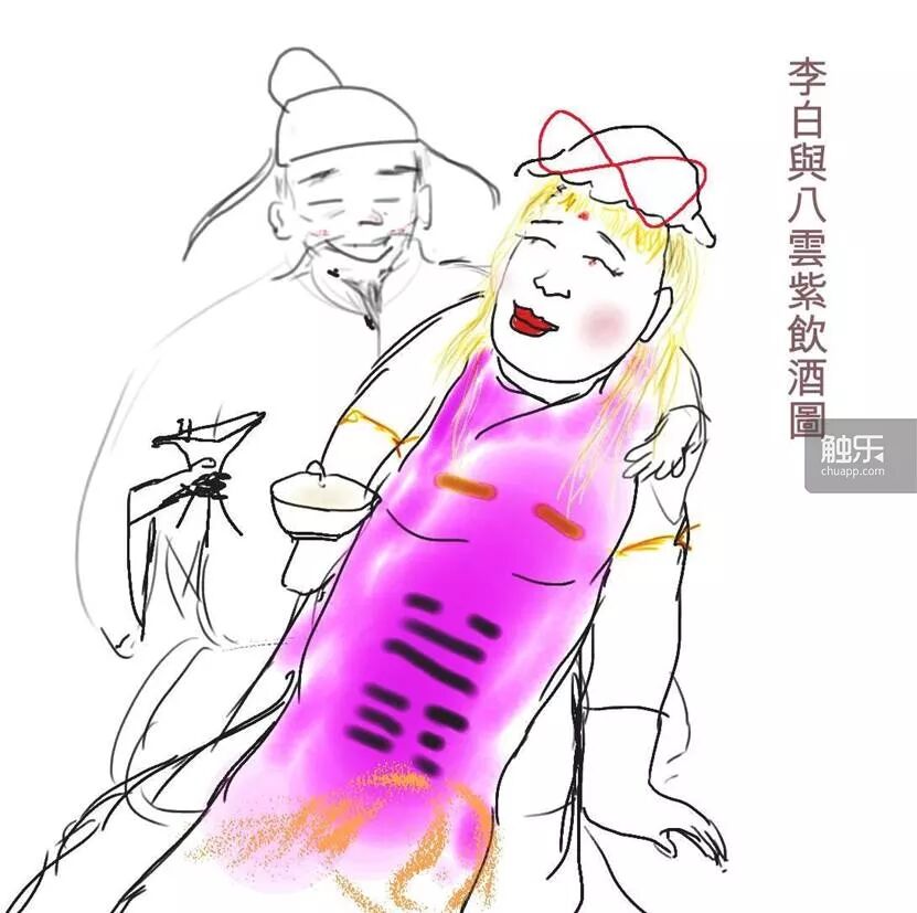 谁来跟我干杯/谁来跟我干杯/谁来跟我干杯/拎上太白和紫妹/谁来跟我干杯/谁来跟我干杯/谁来跟我干杯~(调寄《童祭》;“谁来跟我干杯”为古龙散文集书名。一说李白有西域胡人血统,所以我画个鹰勾鼻,应该也是很合理的)