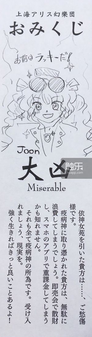 官方玩梗,例大祭15签名会抽选签:“抽到依神女苑的你…请节哀顺变吧/你已经被瘟神附体,必将浪费很多钱财/在即卖会上散完了财,也许还会在手游里面重氪/这都是疫病神的错。接受现实吧.坚强地活下去一定会有好事发生的!”(中译引自THBWiki(thwiki.cc))