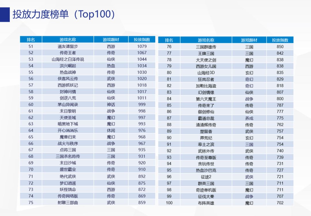 而在第51到底100这个区间,游戏类型变得比较丰富,而传奇类产品的数量最多。