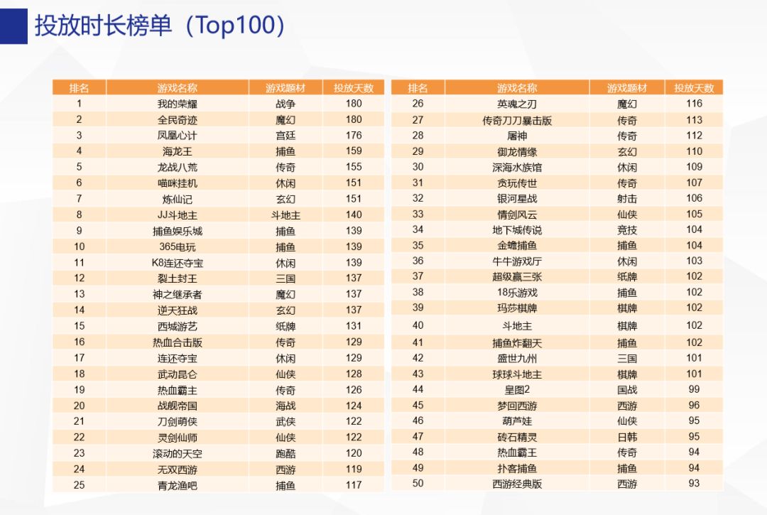 从投放时长来看,投放时长TOP10中仅有一款传奇,《龙战八荒》以155天的投放天数排在TOP5。投放时长TOP3的产品分别是《我的荣耀》、《全民奇迹》、《凤凰心计》。纵观榜单,入榜的游戏类型非常丰富,数量较多的是休闲、捕鱼、棋牌等类型。