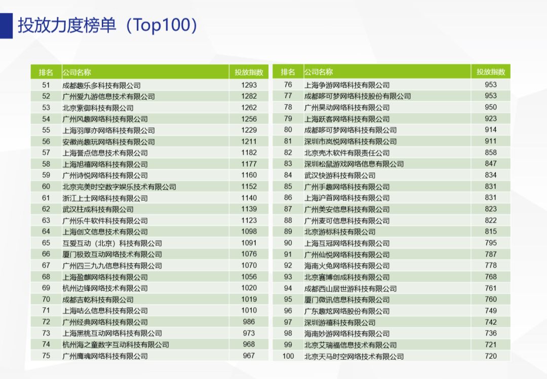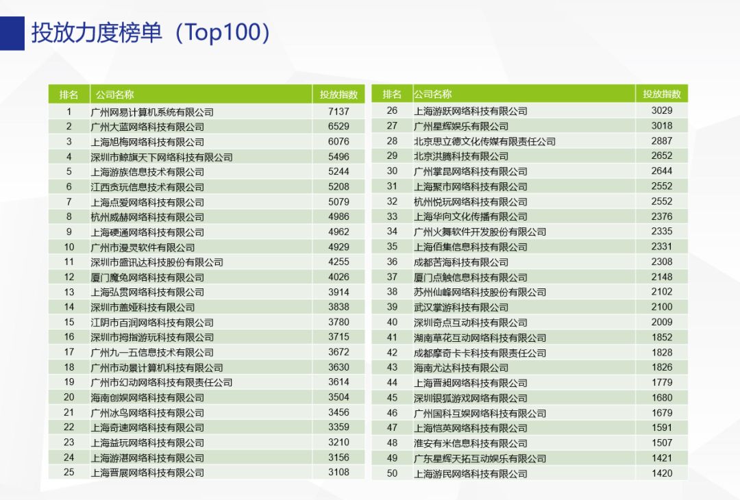 以投放力度为划分标准,2018上半年投放力度最大的公司是网易,投放指数高达7137,分列二三名的是大蓝网络和旭梅网络。从投放指数来看,想要进入到TOP100的公司,投放指数至少要达到720以上。