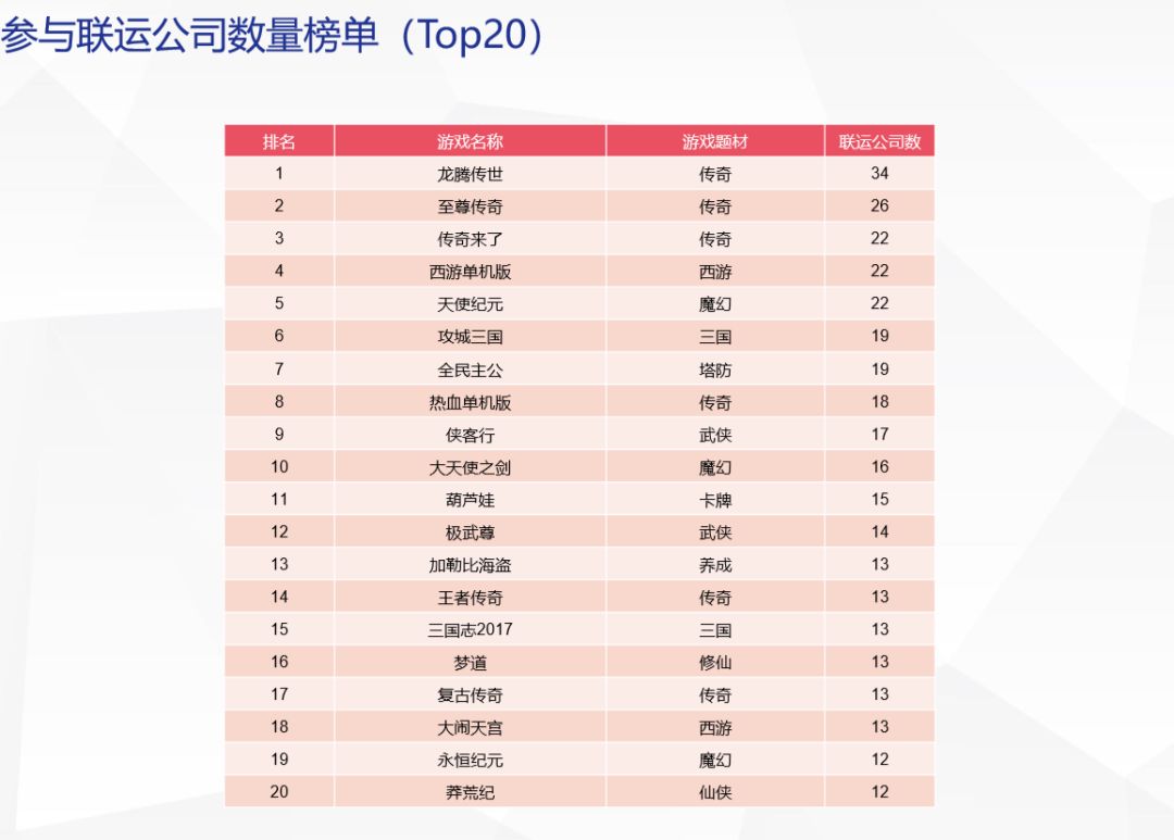 从参与联运公司的数量来看,联运公司数TOP3的游戏均为传奇,分别是《龙腾传世》、《至尊传奇》、《传奇来了》。整个TOP20榜单中,传奇类产品一共有6款,几乎占据了榜单的三分之一名额。