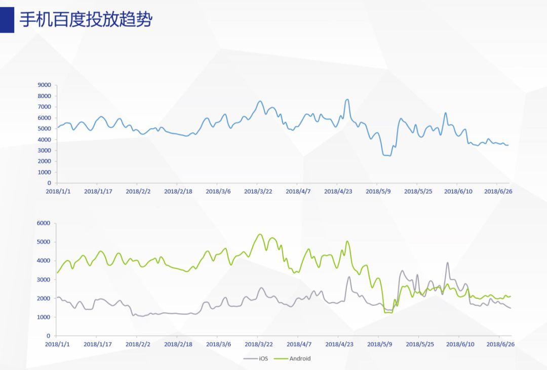 2018上半年,手机百度的手游每日投放量基本保持在5000以上。Android端的每日投放量则保持在3000以上,5月份有所下跌;iOS端的投放量与之相反,在5月份开始上升,投放量一度接近4000。