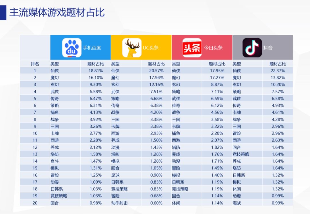 从游戏题材来看,仙侠类在手机百度、UC头条、今日头条、抖音等渠道的占比都是最高的,魔幻类、玄幻类则分列四个渠道占比的第二、第三名。可以看到,渠道占比较高的基本上是一线买量题材。