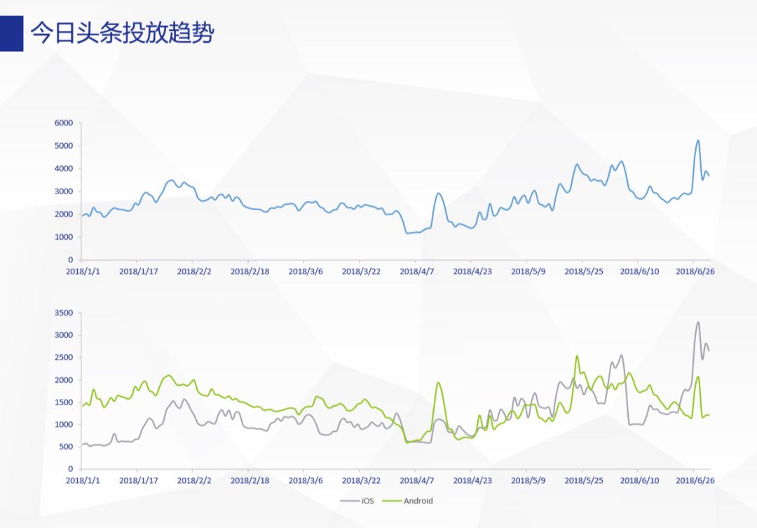 2018上半年,今日头条的手游投放盘子总体呈上升态势。按照系统划分,Android端的投放量有所减少,而iOS端的投放量持续升高,最高超过3000。
