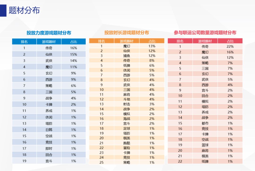 按照游戏题材划分,投放力度最大、参与联运公司数量最多的游戏类型均为传奇,而投放时长最高的游戏类型则是魔幻类。