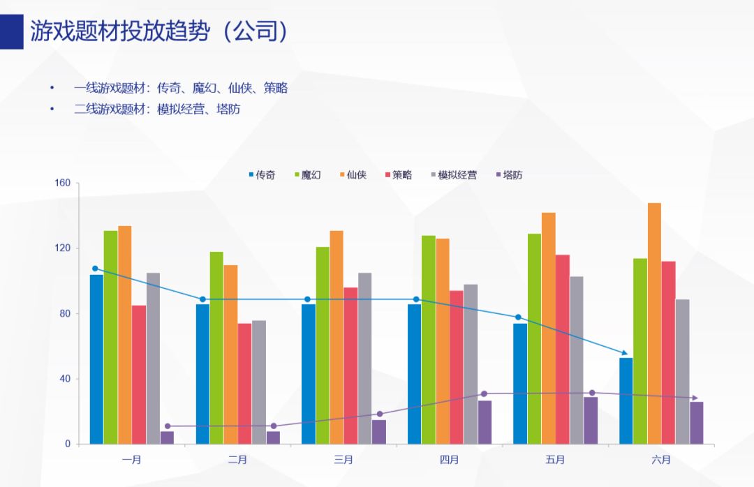 按照游戏题材划分,传奇类、魔幻类的投放素材数整体均成下降趋势,而仙侠类、策略类游戏投放素材数回暖。此外,模拟经营类、塔防类等非热门题材的投放素材数在上半年也有所增多。