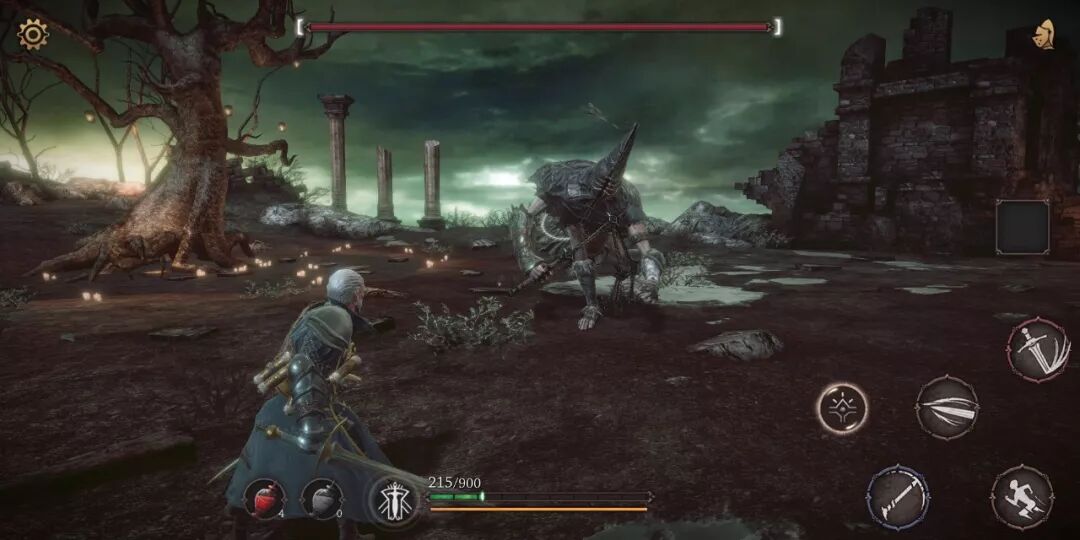 从整体感觉来说,《帕斯卡契约》确实有一些“魂”系列的影子,包括难度、与敌人1V1单挑的感觉等等。传统手游一般来讲除了普攻以外一个按键就是一个技能,点一下就放一套动作。但《帕斯卡契约》的按键设定基本还是依循主机的思维,按键区基本就分成轻攻击、重攻击、枪技、格斗技和特殊键,几乎所有动作都由不同的按键组合来触发,甚至还有按住不放的重击、挑空、追击等技巧,都是按照主机游戏的思路进行设计的,动作是否华丽全看玩家操作。