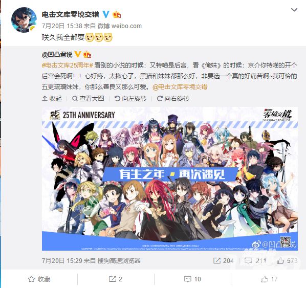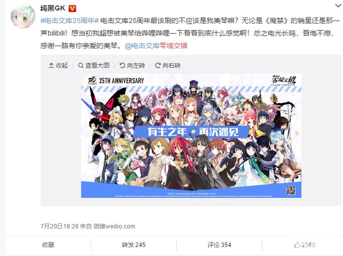 B站营销之后,紧接而来的是第二部分也就是围绕电击文库25周年的一次话题营销。《零境》游戏IP来源于日本轻小说品牌电击文库,而7月20日这天正值电击文库25周年,《零境》自然不会放过这个难得的机会。