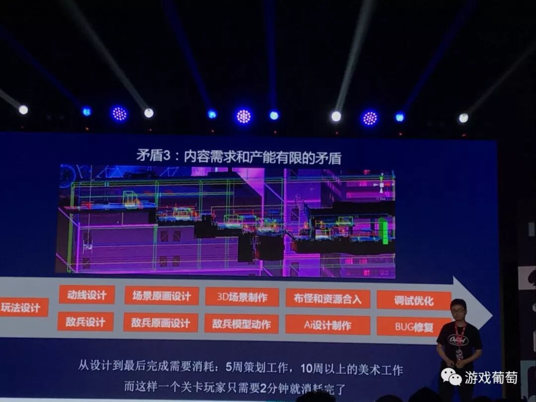 第三个矛盾应该也是研发同行都会遇到的,就是内容需求和产能有限的矛盾。这个矛盾在一个以PVE为主的游戏当中尤其尖锐。这张图是我们关卡设计,在我们游戏当中,关卡整个生产过程或者制作过程路径非常长,整个过程中从建模、设计到优化,涉及的人和环节都非常多。大家应该知道在魂斗罗当中有动线,这个动线要比其他游戏设计成本更高,因为每一关都需要不同。整个高昂的关卡设计成本给我们带来非常大的困难,从设计到完成,需要消耗五周策划的工作和十周以上的美术工作,而这些工作对玩家来讲是两分钟,这是非常恐怖的事情。
