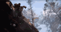 在此阶段,我们加入了巴德尔拖拽住奎托斯,并把他扔向高处的动作。这个动作(或者说镜头的使用)其实是某种障眼法:后面的动作是两个人翻滚到了屋顶,而这个动作发生时的镜头设置让玩家觉得奎托斯已经飞得足够高了,从而顺接后面的动作。这也是我们在后面的转场动画中经常使用的“小伎俩”:我们会使用一些快速运动镜头,或是强烈的镜头晃动,从而避免设计多余的动作。注意啦,这是烟雾弹哦。
