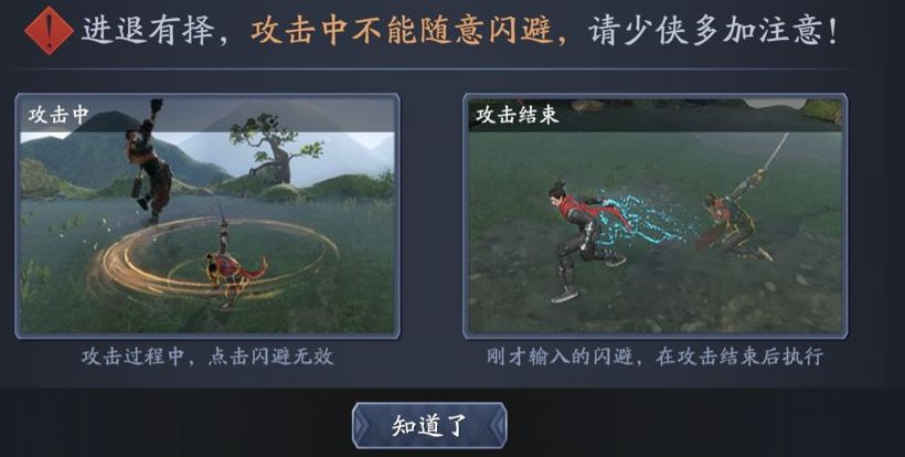 其实玩家一进入游戏就能收到开发者的警告:还啥都没干呢,就弹出提示说,这个游戏里攻击的时候不能闪避,必须得等攻击动作做完才能闪避。