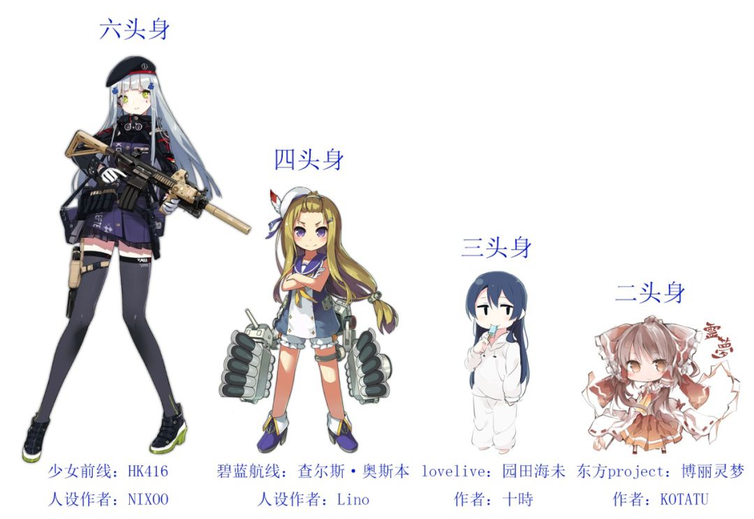 如下图:我们可以看到,和一般正常比例的动漫人物相比,Q版人体的头身比例有明显特点,一般的人体多为六、七头身(如下图最右的HK416),而Q版多为二头身到五头身。在作画时,我们要根据项目要求,或者自己想的风格,掌握头身比,这样就能避免风格不搭的问题了。