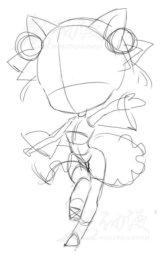 小贴士:当我们在处理二头身Q版时,一方面要夸张身体动态,同时也要做到重心的稳定。