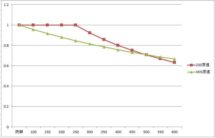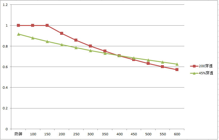 由上图可看出,在敌方的护甲低于425点的时候,200点穿透的作用强于45%穿透,450点之后则效果低于45%穿透