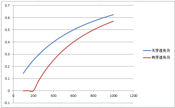 免伤值是不会大于1的,为一个平滑的弧线成长,同时在攻击方有无穿透的时候呈现两种状态,如下: