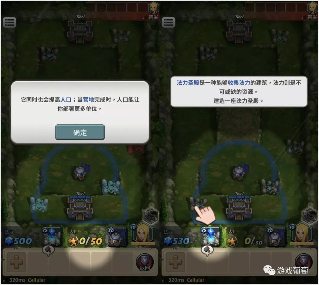 开局后,玩家会以一定缓慢的速度获得基础资源(法力),并且有两种可选的基础建筑——法力圣殿和营地。
