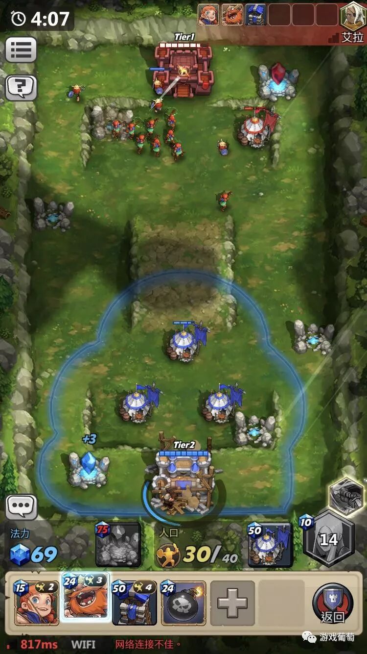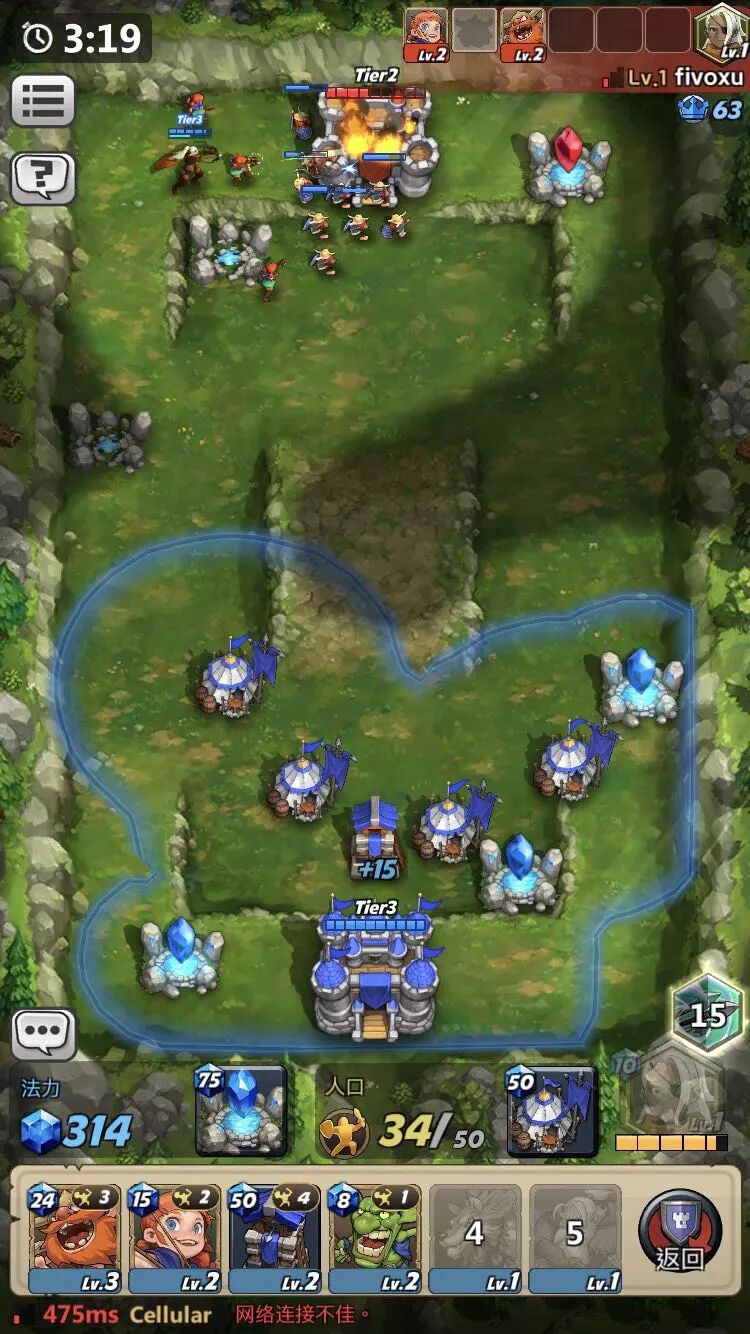 经典RTS基地分三级的设定,在《火战攻城》里也有契合移动端的设计。每部署2张卡牌,城堡就会自动开始升阶。二阶、三阶解锁的高级兵种,往往有着更高的资源消耗和更强的属性。类似的兵种分层,也让“快速攀升科技憋大兵”等比较极端的战术成为了可能。