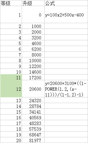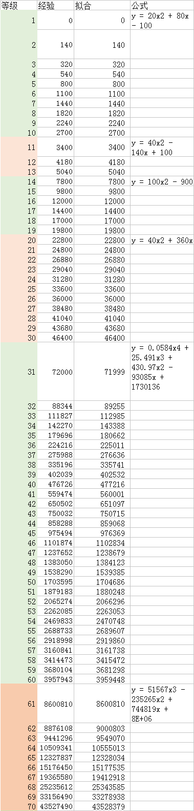 接下来我们把最后一列的经验拟合成函数交给程序员就是玩家看到的经验了。可以看到,在经验的设定过程中,我们首先设定的是期望的玩家的游戏新节奏,然后根据战斗节奏将其换算成需要的战斗场次,再设定单场战斗经验,最后计算出每个等级升级所需要的经验。