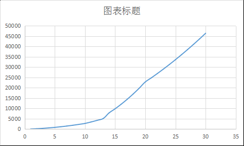 这里其实还有一个细节,就是根据我们前面的分析,前期我们希望快速升级,那么为什么不能保持战斗场次不变,让等级经验线性提升呢?其实我个人认为,在非常前期,比如前30级,直接作成线性的经验曲线也没有什么问题,因为在这个等级区间中,基本上是一场战斗/一个任务就可以升一级,刻意在公式中强调场次的变化没有什么太大的意义,我们拉出梦幻中1到30级的曲线,其实也是接近线性的: