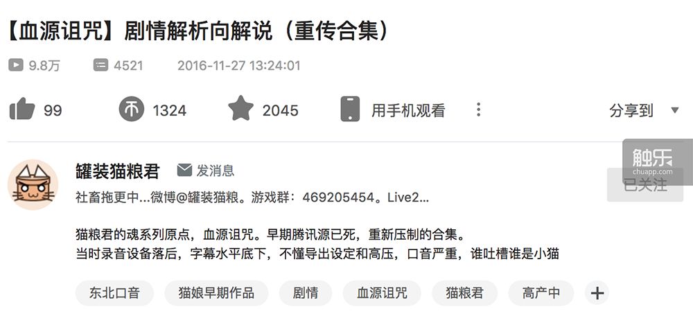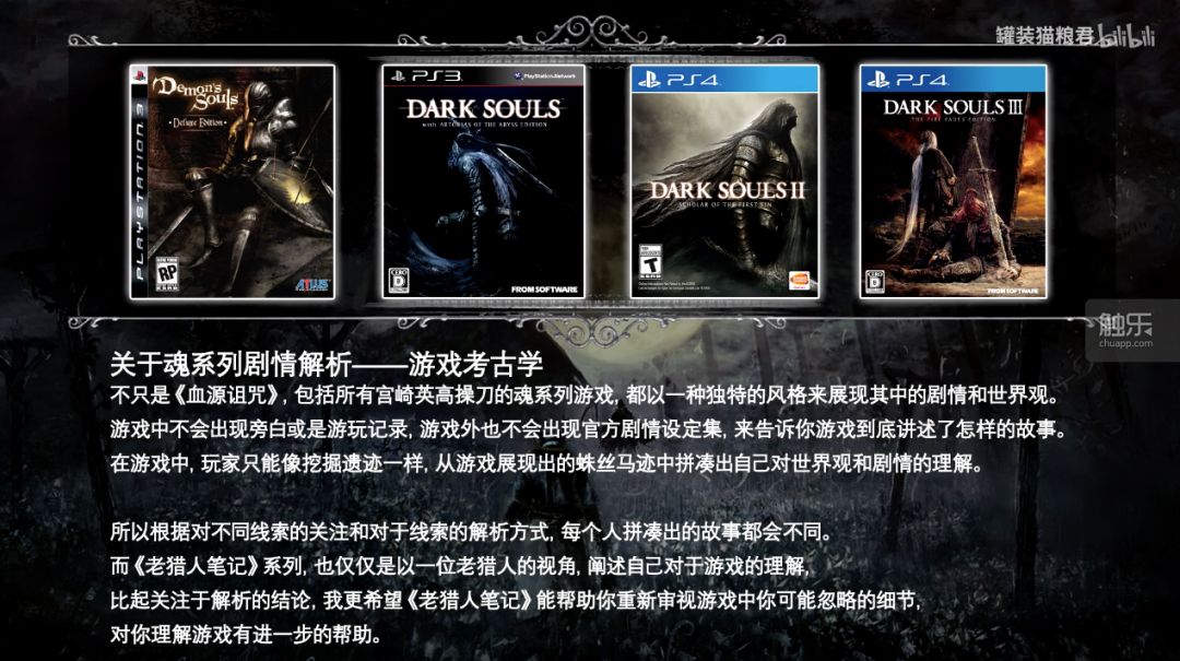 猫粮是个名副其实的“魂学家”。自《恶魔之魂》起,他就接触了“魂”系列。而推动他将自己对游戏的喜爱转化成表达、从一个玩家变为一个视频制作者的契机,则是《血源诅咒》。