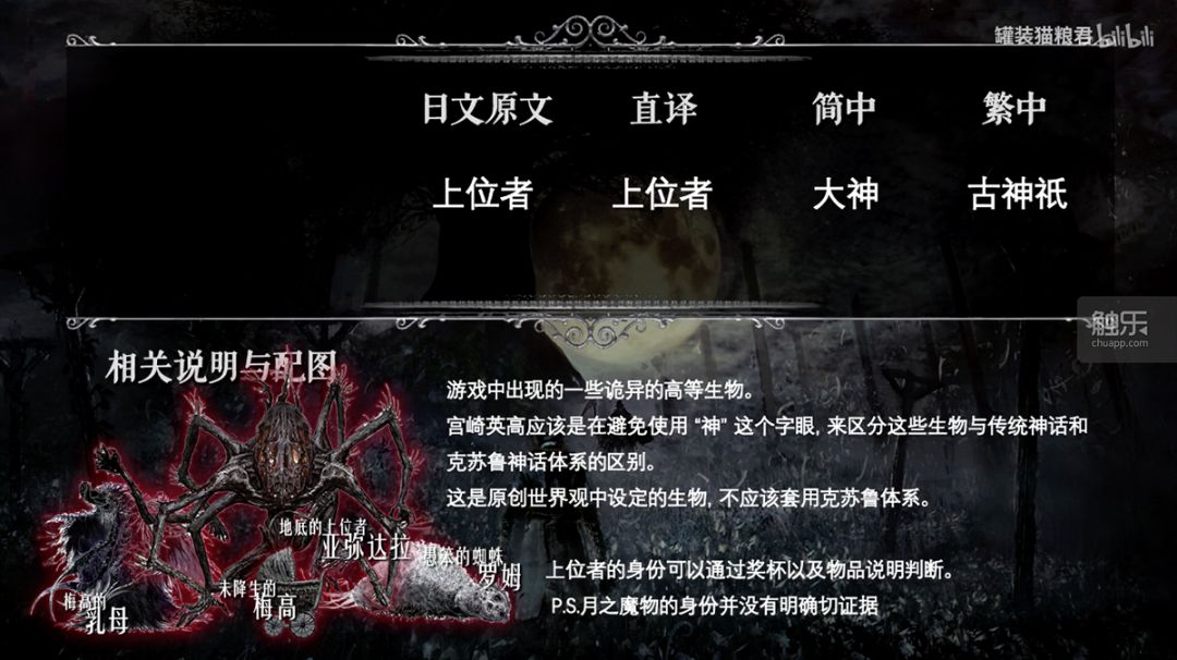 《血源诅咒:追译溯源》中,猫粮对日文原文、简中、繁中3个版本中的一些词语进行了详细对比,并附上了解说