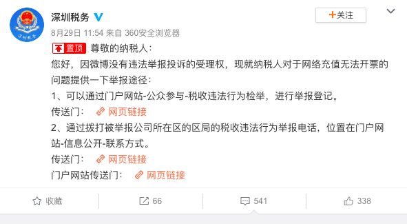 因此,根据《发票管理办法》的规定,当玩家完成充值后,游戏厂商作为收款方,应当是有义务向付款方开具发票的。游戏厂商拒绝开具发票的,玩家们完全可以向税务机关举报。事实上,此次“826圣战”中,玩家们就已经“攻占”了深圳税务局的官微,纷纷留言举报腾讯。为此深圳税务还特地发博指导玩家们如何进行有效举报。