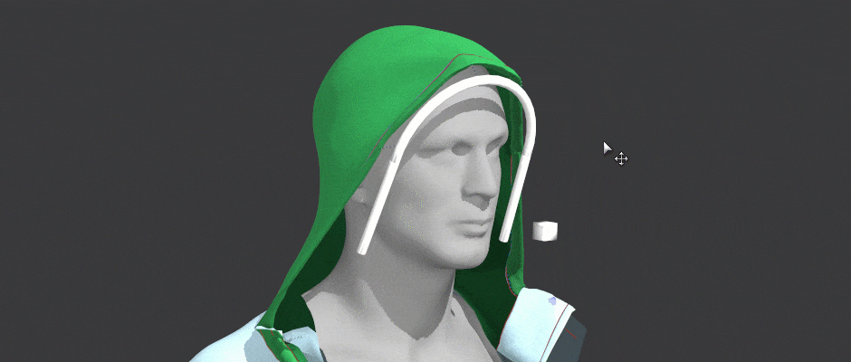 有时候,你可以导入其他的Avatar模型帮助服装造型,例如帽衫的帽子,我导入一个U型的模型,然后使用Track on avatar工具去跟随这个U型模型,当我移动和旋转这个模型,帽子部分就会跟随进行解算。