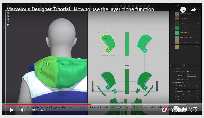 要为布料添加厚度,你可以在MD中复制单独的板片作为服装的内衬,这样可以得到更多的一些褶皱,在2D窗口,右键点击你想要做内衬的板片,选择Layout Clone(over)或者Layer Clone (under).