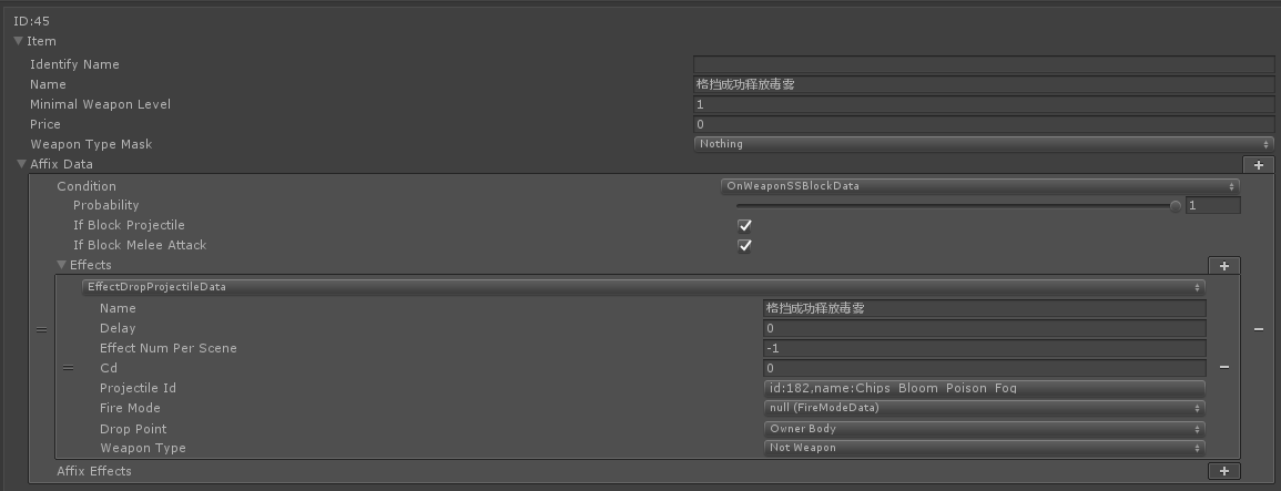 比如下图是一个武器词缀的编辑器,我们制作了大量的触发条件以及词缀效果,策划可以在编辑器中自由组合,产生出全新的词缀效果,条件和效果中的参数开放给策划来调整。