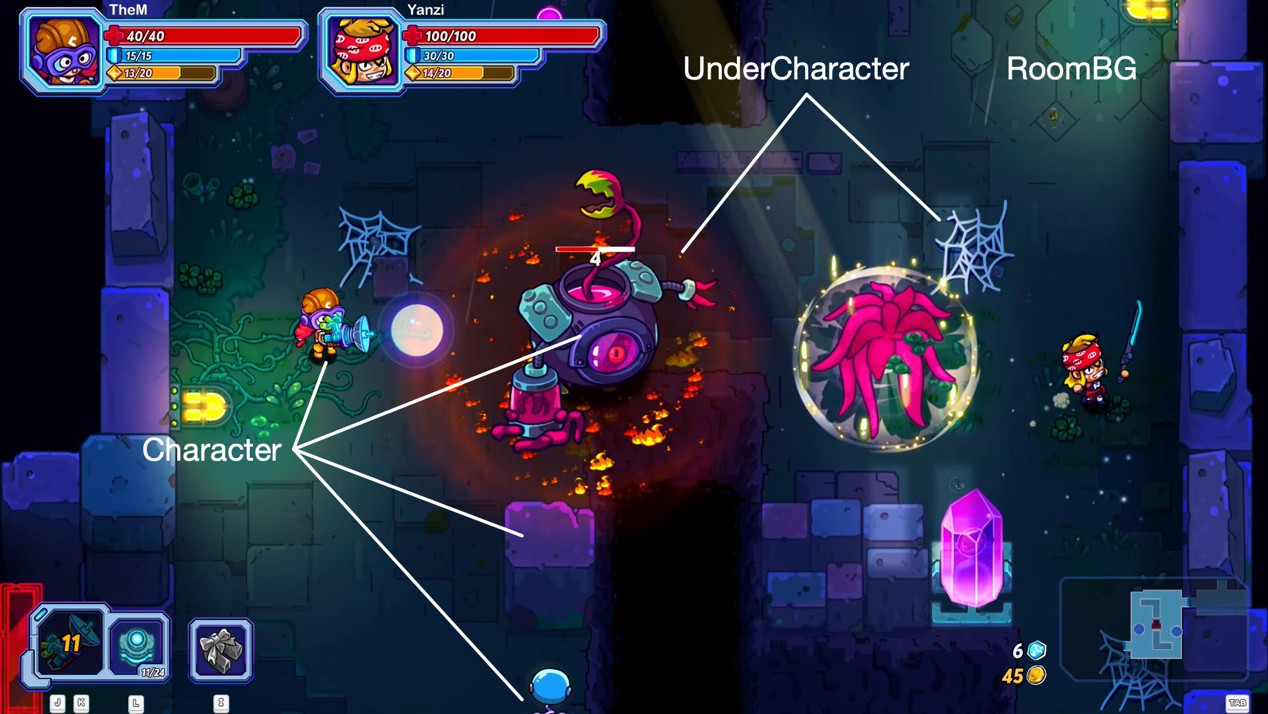 首先,对于静态的物体以及能够明确场景中层级的问题,我们在Sorting Group中设定好对应的Sorting Layer,来确保总体层级上不出错。比如关卡房间的地面,设定为RoomBG, 角色设定为Character, 像地面上的岩浆、毒液等,它们应该处于地面和角色之间,暂且定义为UnderCharacter,使得在最终渲染时 RoomBG > Character > UnderCharacter。