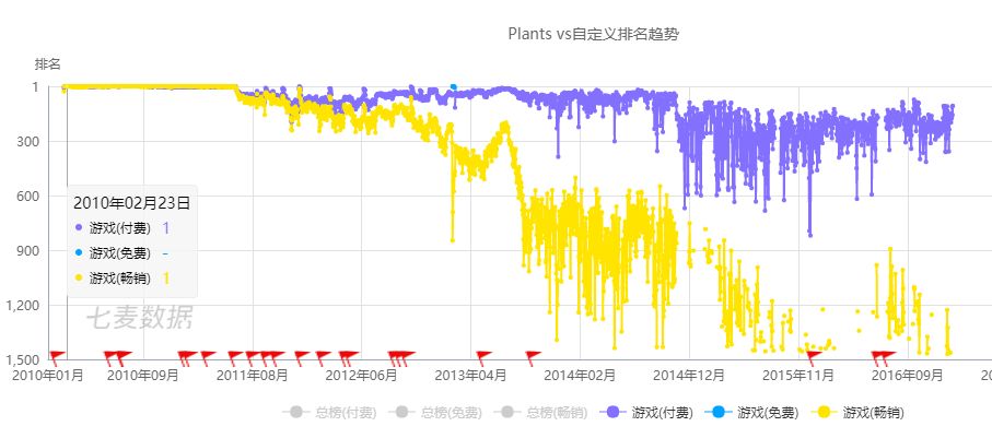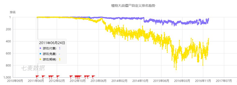 2010年2月,PopCap旗下的《Plants vs. Zombies》(植物大战僵尸)拿下游戏付费榜以及畅销榜TOP1;2011年6月24日,《植物大战僵尸》接档其第一的位置,这款游戏直到2013年下半年才开始式微。